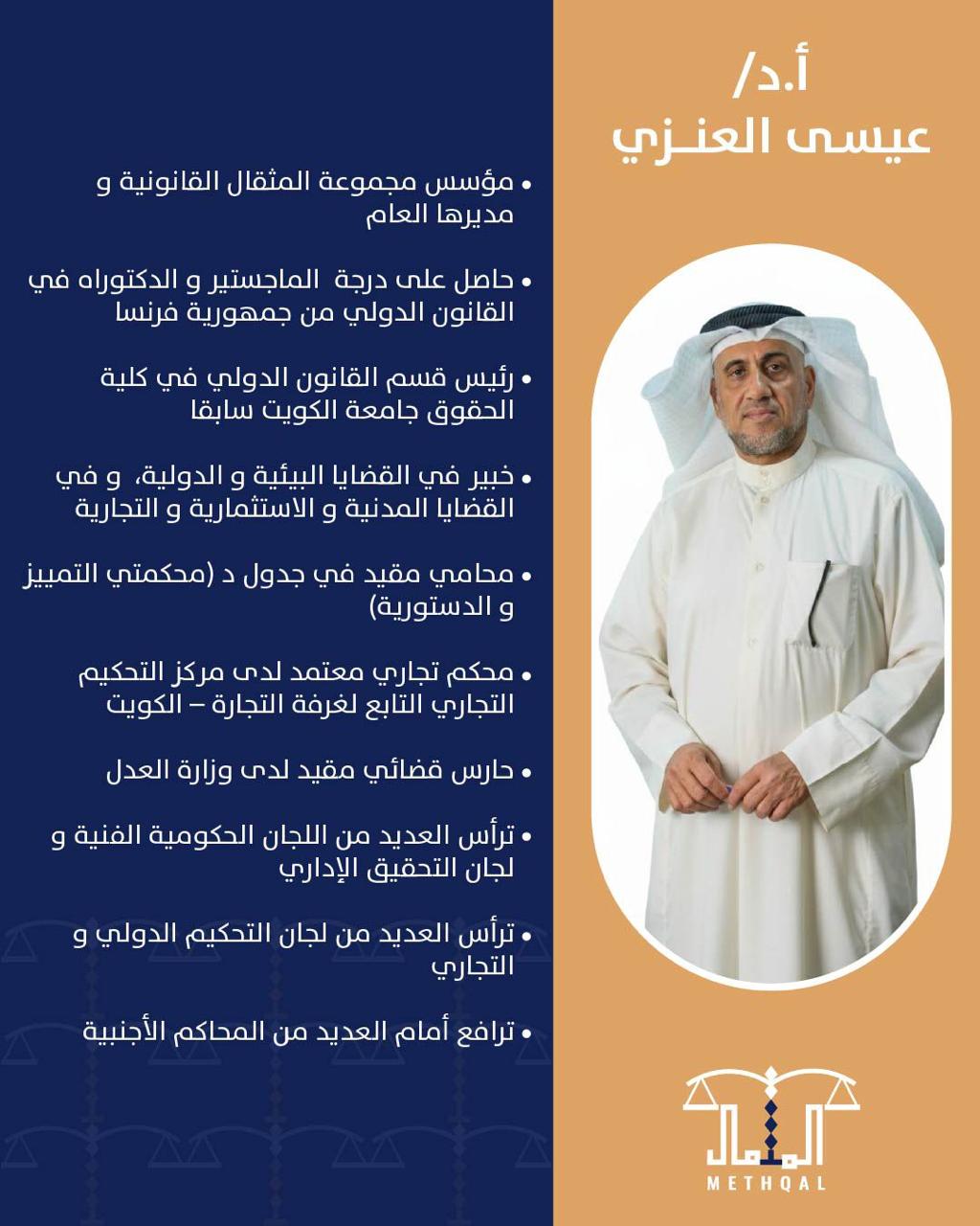 Methqal Law and Legal Consultations Group is one of the legal groups, which is licensed to practice its profession in providing law and legal consultations to individuals and local and foreign companies. The group embraces distinct elite of professional cadres of lawyers and consultants with high experience that extends for many years in all branches of law, as well as a qualified staff in order to provide legal consultations and services with a high degree of professionalism and quality that achieves the interests of our clients, gains their trust and meets their requirements, whether inside the State of Kuwait or abroad, with the help of our partners in many countries, as our group has many partnership agreements that enable us to meet the needs of our clients and support them legally outside the State of Kuwait.